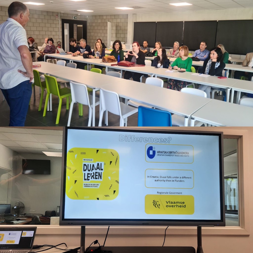 U sklopu Erasmus+ projekta Joint Mentorship: Better Cooperation for Better VET organiziran je studijski posjet u Belgiju od 5. do 7. lipnja 2023. godine. Na studijskom posjetu je sudjelovalo 8 sudionika iz Hrvatske, 7 iz Rumunjske i 7 iz Sjeverne Makedonije. Sudionici su imali priliku bolje se upoznati sa sustavom strukovnog obrazovanja u Belgiji, s posebnim naglaskom na modelu dualnog obrazovanja o čemu je prezentaciju održao Gunther de Geeter, zamjenik ravnateljice u srednjoj strukovnoj školi u Geraardsbergenu. S obzirom na to da model dualnog obrazovanja uključuje najviše praktične nastave kod poslodavaca, sudionicima je bilo interesantno steći uvid navedeni sustav obrazovanja te iz primjera dobrih praksi prenijeti iskustva u svoje države. Uz prezentacije organizirani su posjeti u 3 poduzeća aktivnih u dualnom obrazovanju – Luc De Jong (elektroinstalacije), Domocura (kemijska čistionica i tvrtka za čišćenje prostora) te Stil Geluk (dom za starije i nemoćne). Sudionici su upoznali rad poduzeća i način na koji se uključuju u dualno obrazovanje te zašto im je bitno da učenici budu na praksi u poduzećima. Također, predstavnici poduzeća su istaknuli primjer dobre prakse u vezi organizacije nastave na način da učenici borave u školi ponedjeljkom i utorkom dok srijedom, četvrtkom i petkom borave na praktičnoj nastavi u poduzećima. Sudionici su stekli uvid u dobre prakse i kroz raspravu zaključili koje bi se prakse mogle implementirati u njihovim partnerskim državama kao i na koji način unaprijediti kvalitetu strukovnog obrazovanja u svojim državama. Sudionici studijskog posjeta bili su nastavnici, mentori u obrtima i poduzećima te predstavnici dionika u strukovnom obrazovanju iz Hrvatske, Sjeverne Makedonije i Rumunjske.