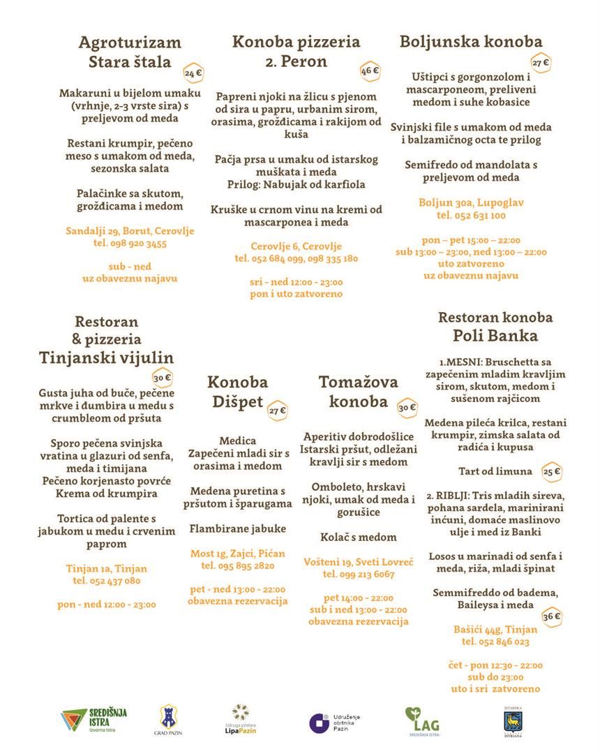 U sklopu Dana mednih delicija posjetiteljima su dostupni kompletni meniji (predjelo, glavno jelo i desert) u sljedećim ugostiteljskim objektima: