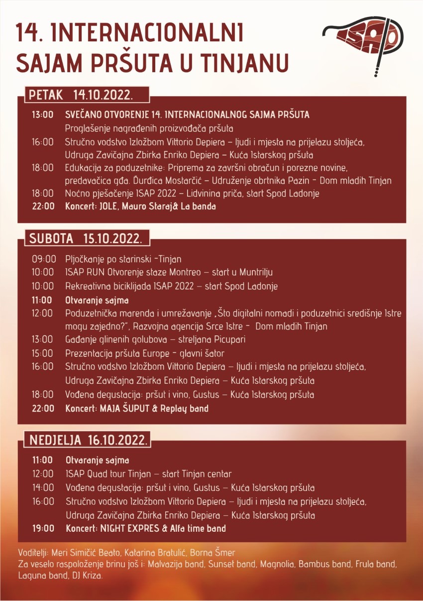 Internacionalni sajam pršuta u Tinjanu (ISAP) nije samo gastronomski događaj i doživljaj: tijekom tri sajamska dana pripremljen je čitav niz pratećih rekreativno-sportskih, edukativnih, kulturnih i zabavnih programa, a osim pršuta na sajmu se tradicionalno nude i vrhunska vina Tinjanštine i središnje Istre te čitav niz drugih autohtonih proizvoda.