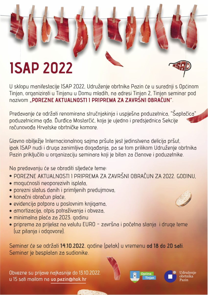 U sklopu manifestacije ISAP 2022, Udruženje obrtnika Pazin će u suradnji s Općinom Tinjan, organizirati u Tinjanu u Domu mladih, na adresi Tinjan 2, Tinjan seminar pod nazivom „POREZNE AKTUALNOSTI I PRIPREMA ZA ZAVRŠNI OBRAČUN“.