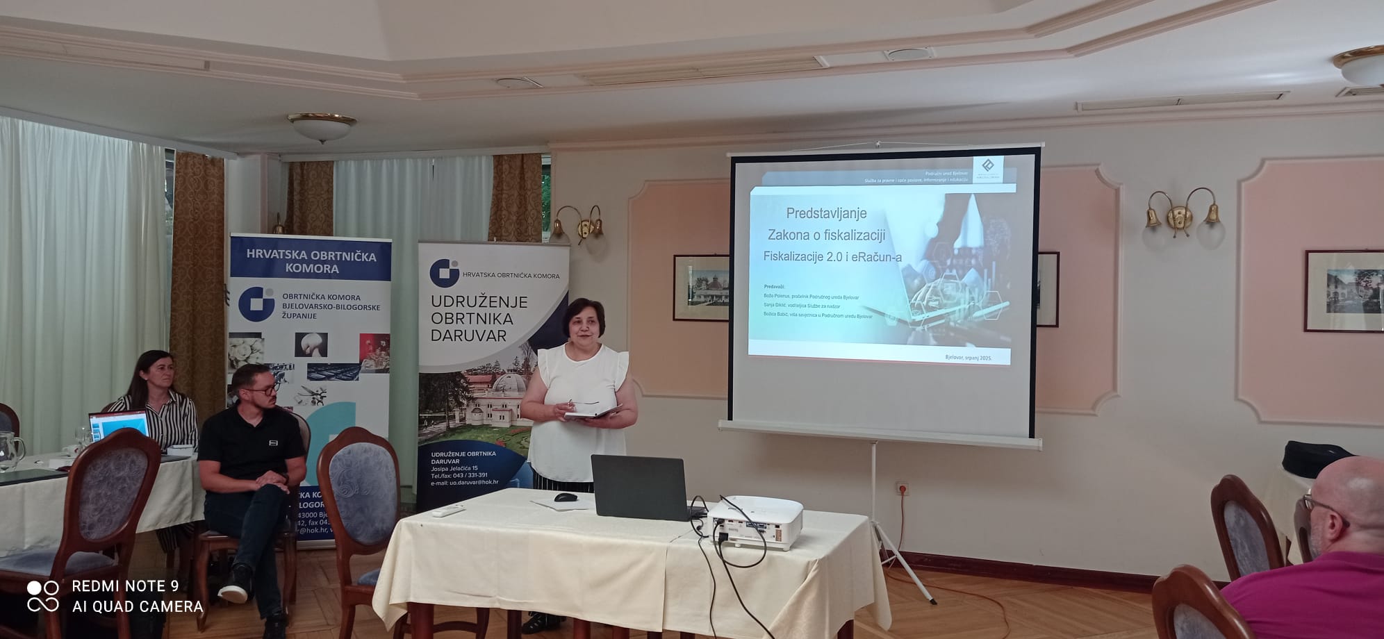 2. Osnove fiskalizacije e-Računa – pročelnik Porezne uprave, Područnog ureda Bjelovar, Božo Polenus, pročelnica ispostave Porezne uprave Daruvar, Davorka Peter te Voditeljice Božica Babić i Sanja Diktić.