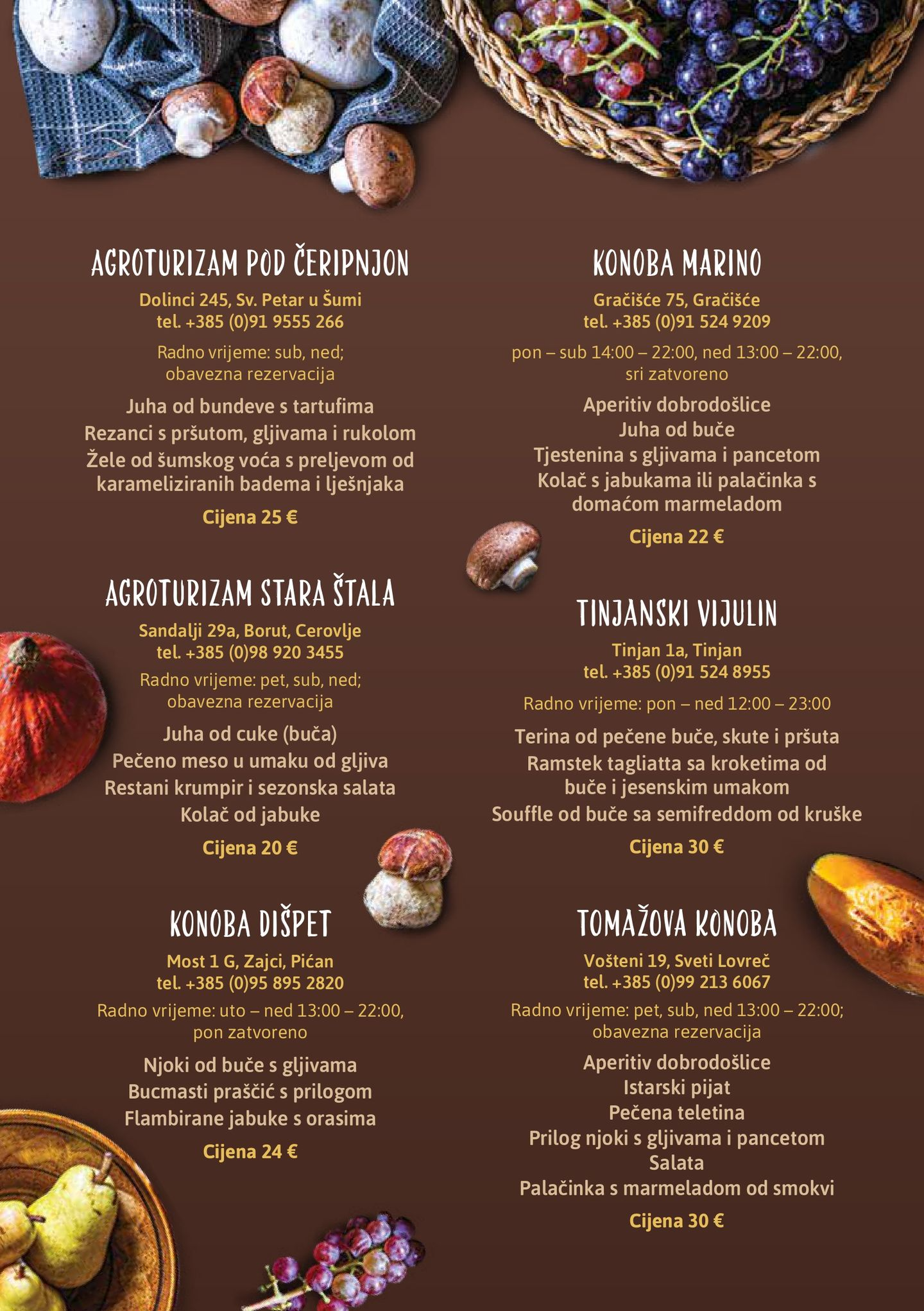 U navedenom razdoblju, svaki dan u redovnom radnom vremenu, ugostitelji će nuditi razna tradicionalna jela istarske kuhinje spravljena od jesenskih namirnica našeg podneblja, a sve u cilju jačanja gastronomske ponude središnje Istre te daljnjeg povezivanja OPG-ova i ugostitelja u razdoblju posezone po promotivnim cijenama.