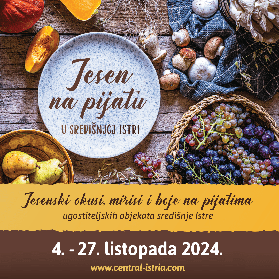 Na područje središnje Istre se po četvrti put vraća gastronomska manifestacija Jesen na pijatu, u sklopu koje možete uživati u jesenskim okusima, mirisima i bojama na pijatima ugostiteljskih objekata u središnjoj Istri. Ove se godine u gastronomsku manifestaciju uključilo šest ugostiteljskih objekta s područja TZ središnje Istre, a u njihovim ukusnim menijima možete uživati od 4. do 27. listopada.