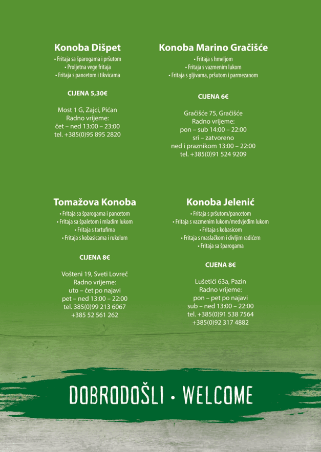 KONOBA JELENIĆ - Fritaja s pršutom/pancetom, Fritaja s vazmenim lukom/medvjeđim lukom, Fritaja s kobasicom, Fritaja s maslačkom i divljim radićem, Fritaja sa šparogama