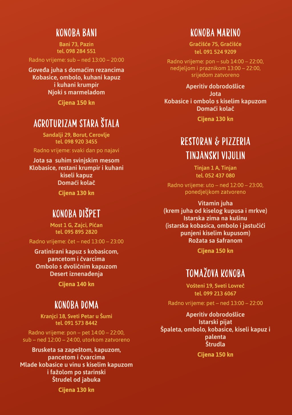 Uvertira u zimsko razdoblje bit će meniji u kojima će glavnu ulogu imati kiseli kupus, a menu će se sastojati od predjela, glavnog jela i deserta te će se nuditi po promotivnim cijenama od 130,00 do 150,00 kn. U manifestaciju je uključeno sedam ugostiteljskih objekata, koji nude sljedeće menije:
